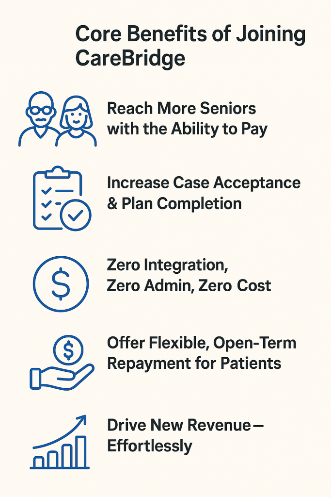 CareBridge™ is a senior care payment and financing network powered by life insurance–backed credit. It removes the financial barriers that delay or prevent care, giving providers guaranteed upfront payment, pre-approved clients ready to begin, and recurring income with zero admin or cost. By aligning provider revenue with patient access, CareBridge™ delivers a frictionless way to grow—while enabling more seniors to receive the care they need, when they need it.
